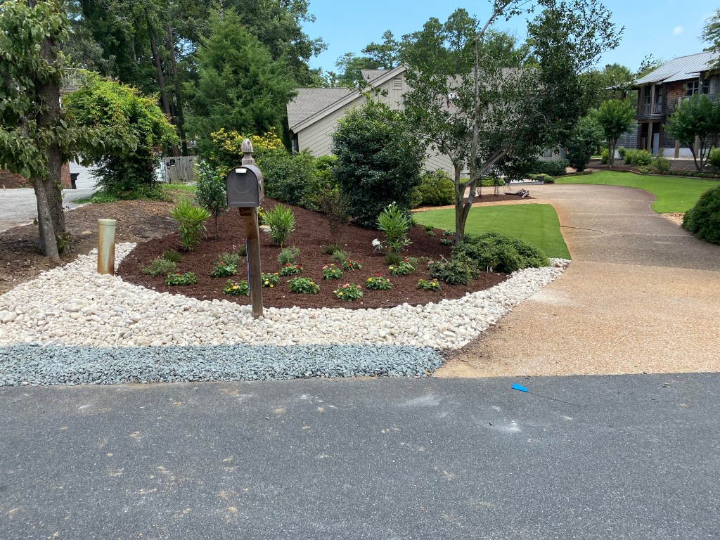 Mulch/Rock Installation: Load and push wheel barrows full of material and install properly.